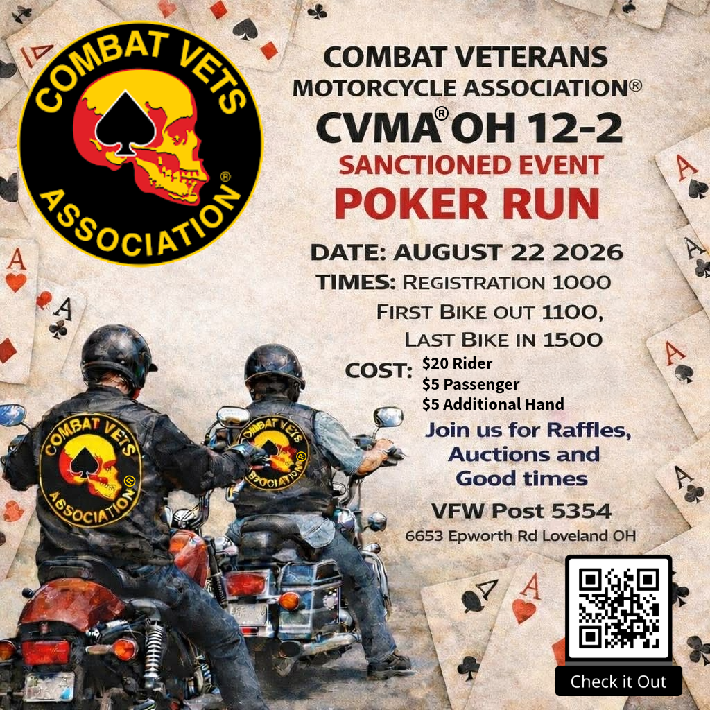 Join CVMA® OH12-2 for a Poker Run to help local veterans and programs. This years event is in conjunction with vfw5354.org annual ALS Concert Event. Join us on Friday August 21st at 1800 for our Meet and Great. With Camping accomadations on site or pricing for local hotels, make a weekend of this event.